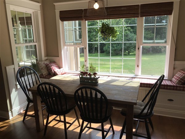 Furniture grade custom wood cabinetry throughout this home. Both bathrooms, Butler’s pantry and four-season room feature porcelain tile. A large breezeway conveniently connects to the garage. The master bedroom and breakfast nook both offer custom-built window seats with deep drawer storage beneath.